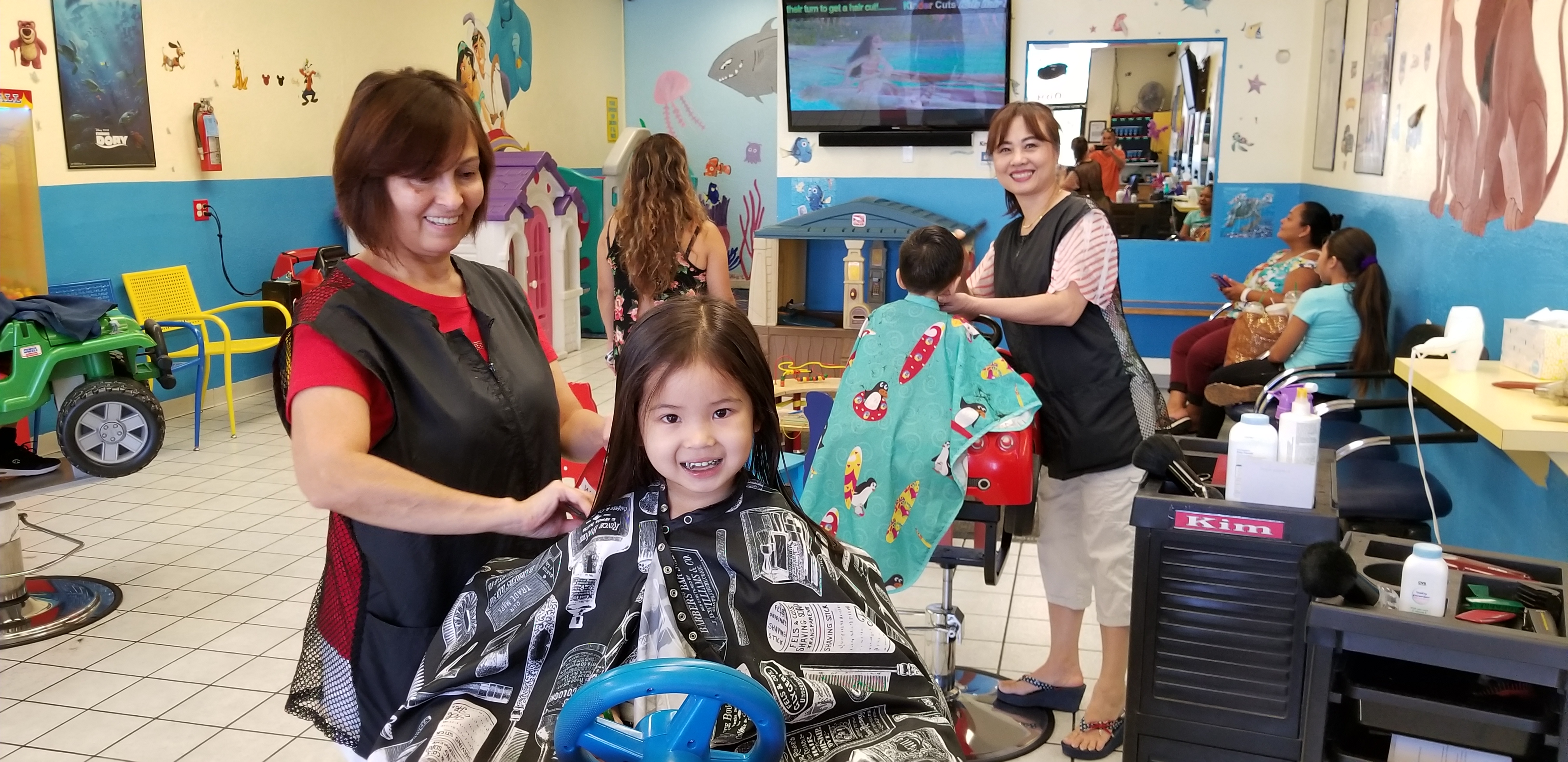 In business since 1992, Kinder cuts is a family owned hair salon specializing in children's haircuts. Our professional staff of hairstylists have over 14 years experience in cutting and styling children's hair. We specialize in kids of all ages. From clipper cuts to bobs to little boy haircuts, we especially cater to our newest customer's "first haircuts!" We reward our little achievers with certificates dated and timed with their first official salon experience. In addition, we have two adult size chairs to accommodate our kids that have outgrown our jeeps and racecars. Moms, Dads, and Grandparents are welcome too! We accept walk-ins and appointments.